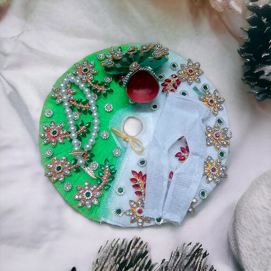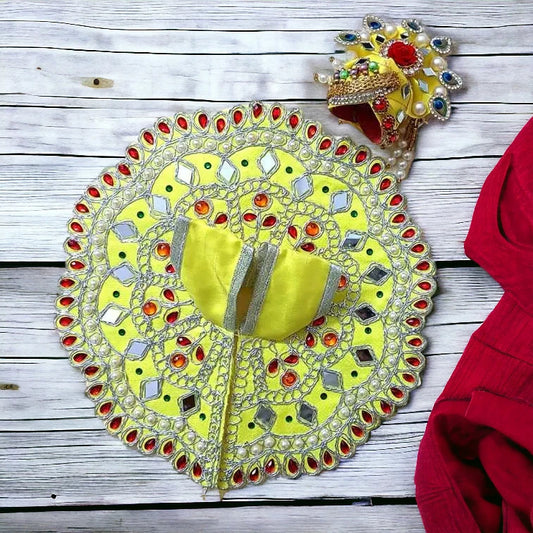 Available in two size options (4 and 5), these outfits are tailored to fit Laddu Gopal idols of different heights. To ensure the right size, simply measure your deity’s height using a measuring tape before selecting the appropriate dress. - Premium Quality Fabric & Craftsmanship: Each dress is meticulously crafted using high-quality cotton and jari fabric, providing comfort and durability. The intricate handwork features colorful stones and fine embellishments, adding a touch of royalty and devotion to your Kanha Ji’s appearance.