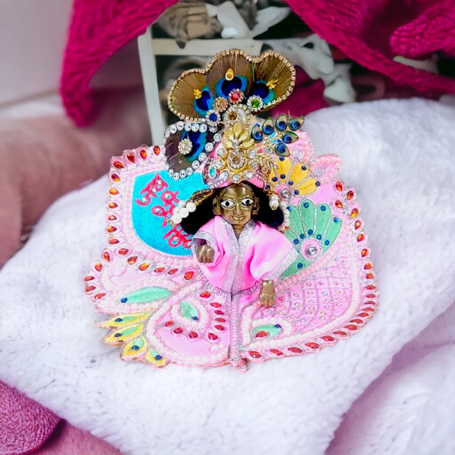 This dress and mukut set, made specifically for Laddu Gopal, is suitable for various festivals and occasions such as Radha Ashtami, Sharad Poornima, Rakshabadhan, Janmashtami, Diwali, and Holi. The perfect choice for devotees looking to dress their Thakur Ji or Bal Gopal traditionally and elegantly. Dress up your Thakur Ji or Bal Gopal in this traditional and elegant set, perfect for special festivals like Radha Ashtami, Sharad Poornima, Rakshabadhan, Janmashtami, Diwali, and Holi. It's the ideal choice for devotees seeking to honor their deity with authenticity and style. With its tailored fit and intricate details, this set is sure to make your Laddu Gopal stand out and feel special during any celebration. Plus, the high-quality materials ensure long-lasting wear.